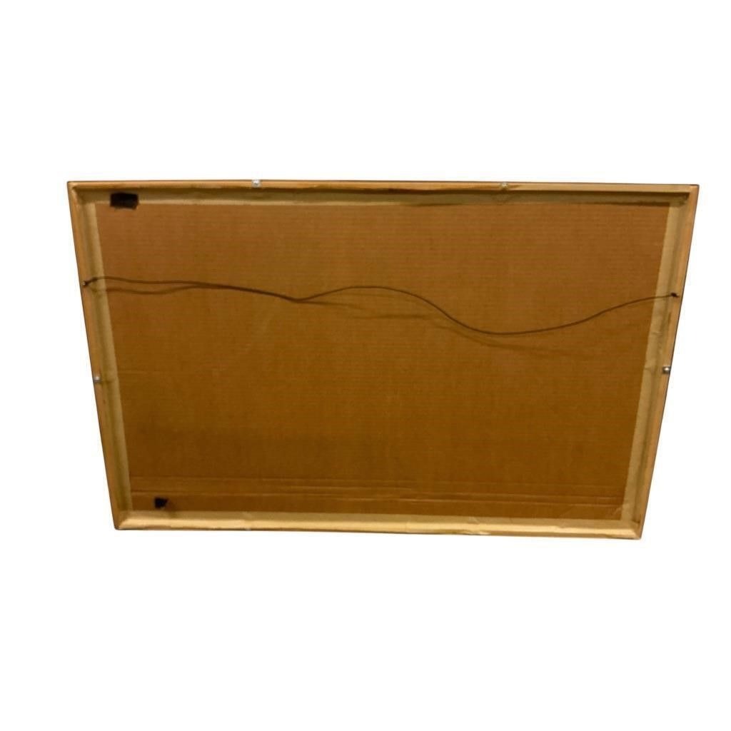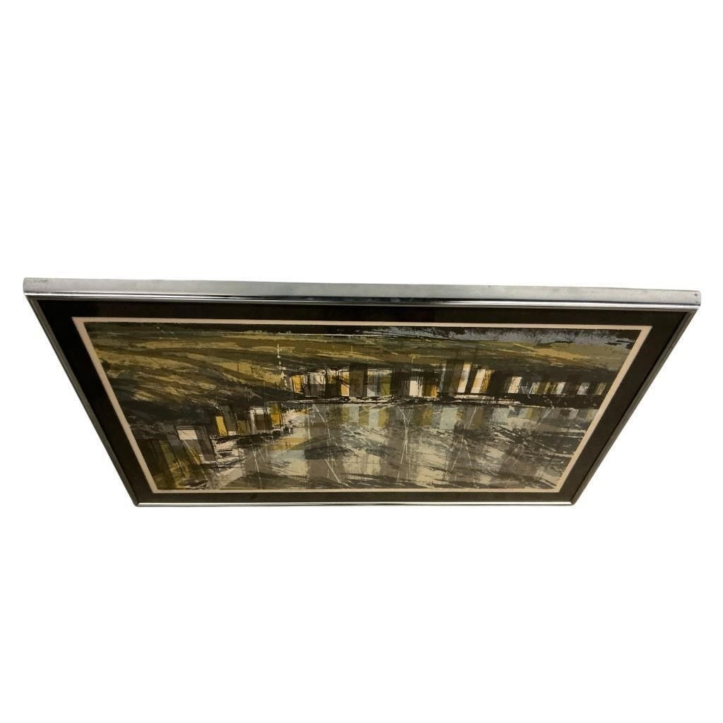 This mid-century framed abstract print features the urban-inspired "City Reflections" design, by artist Howard Bradford. A signed and limited-edition piece, numbered 9/75, it showcases a unique composition that adds depth and character to your decor. Perfect for collectors of vintage art.