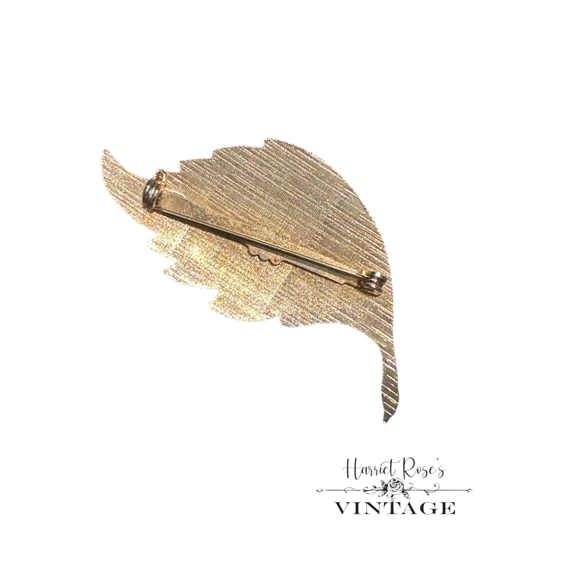 A charming vintage brooch shaped like a leaf, crafted with green enamel and gold-tone metal. Adds an elegant touch to lapels or scarves.