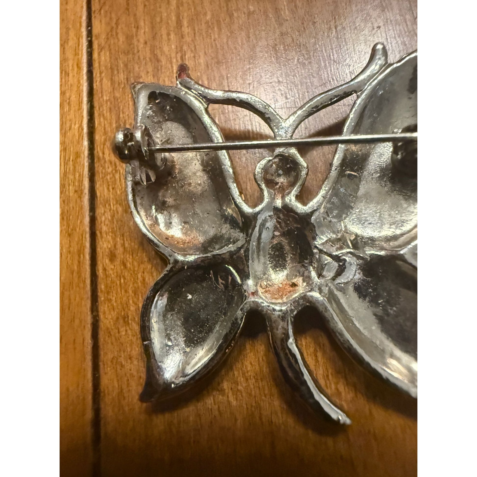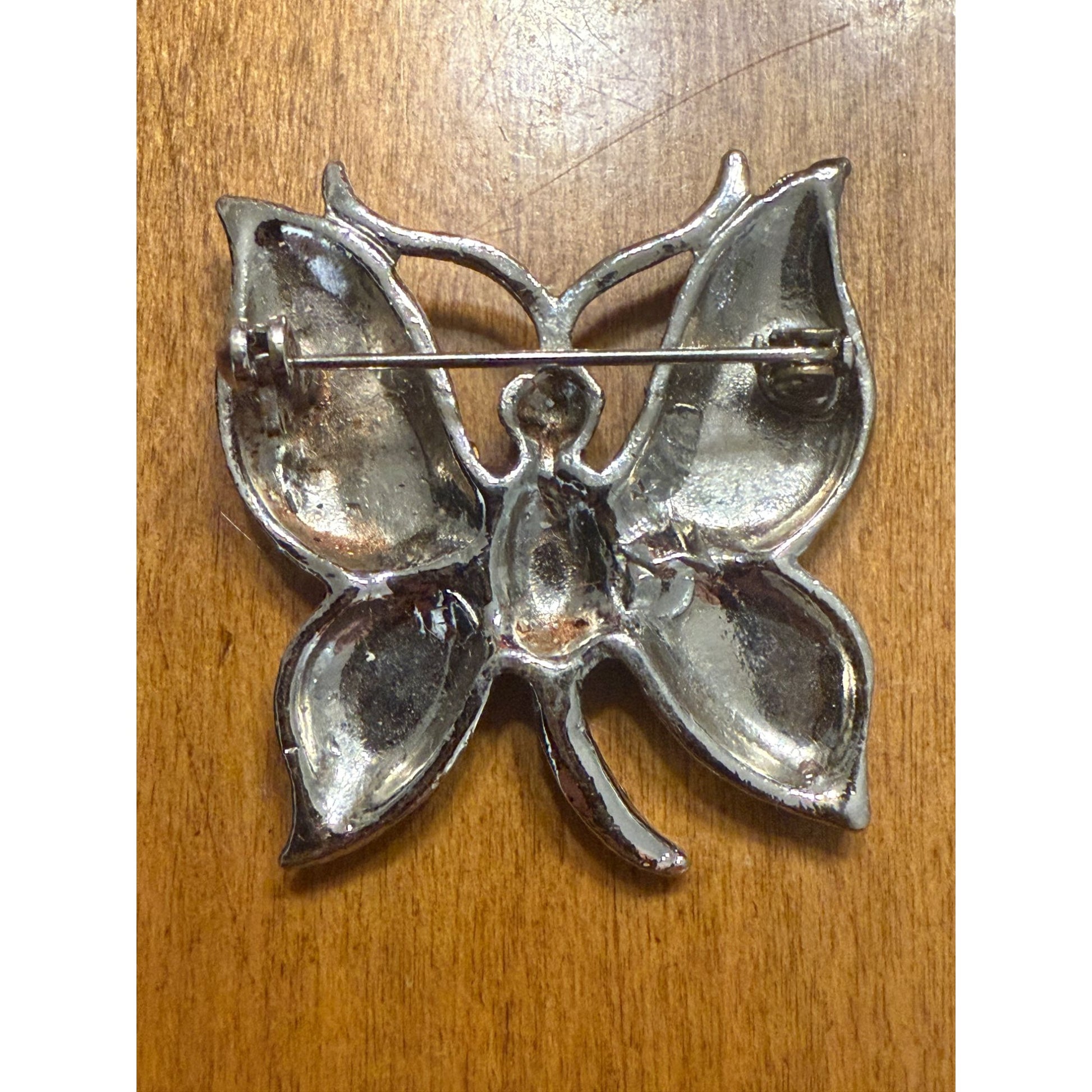 This vintage butterfly brooch captures timeless elegance with its silver-tone finish and delicate rhinestone embellishments, offering a charming accessory for any collection.