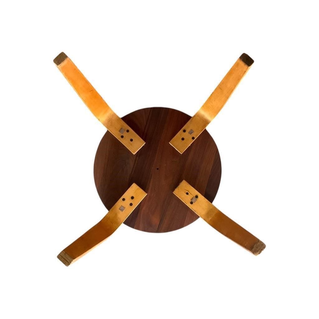 This vintage Danish side table in Alvar Aalto style features a classic bentwood leg design and rich walnut top, blending function with mid-century modern aesthetics for timeless appeal.