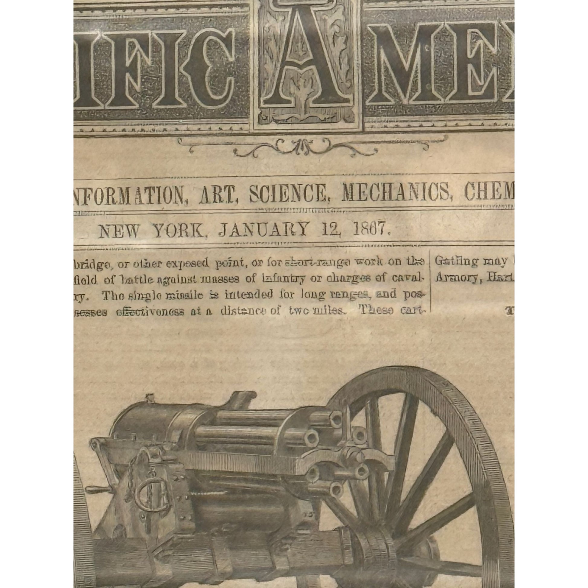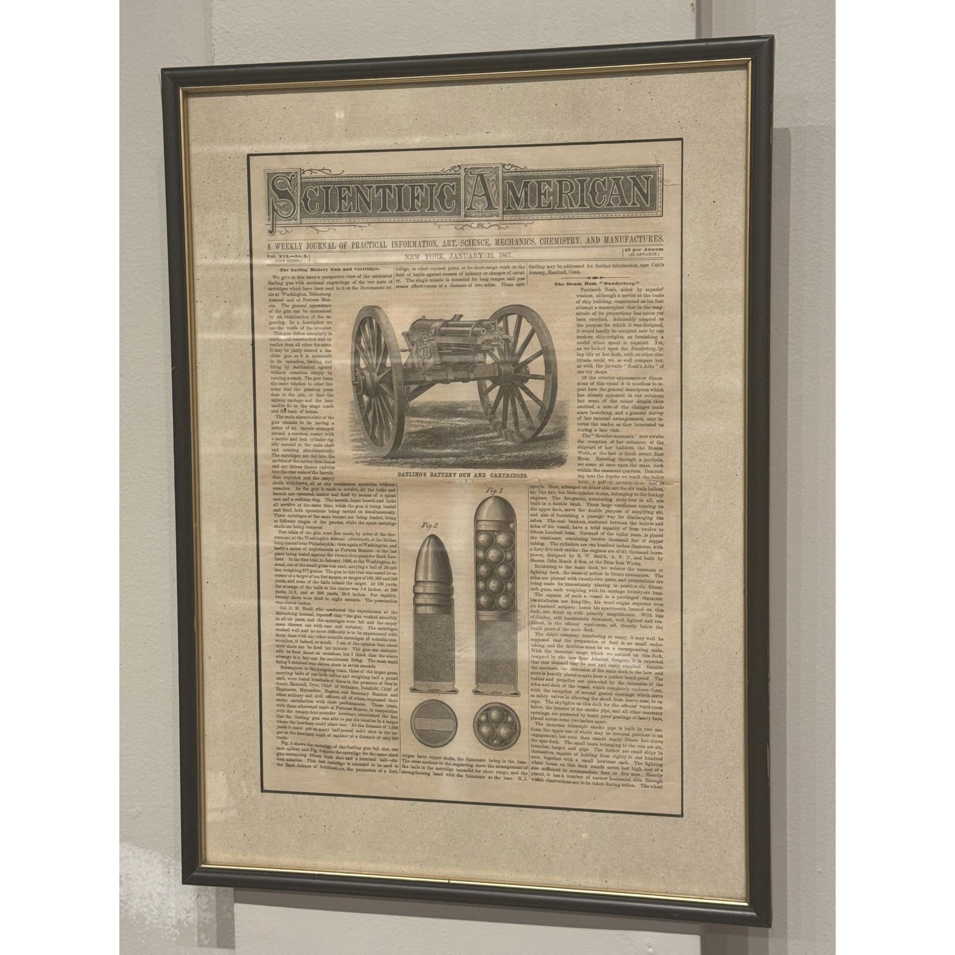 Antique Framed 1867 Scientific American Print Featuring Gatlings Battery Gun & Cartridges