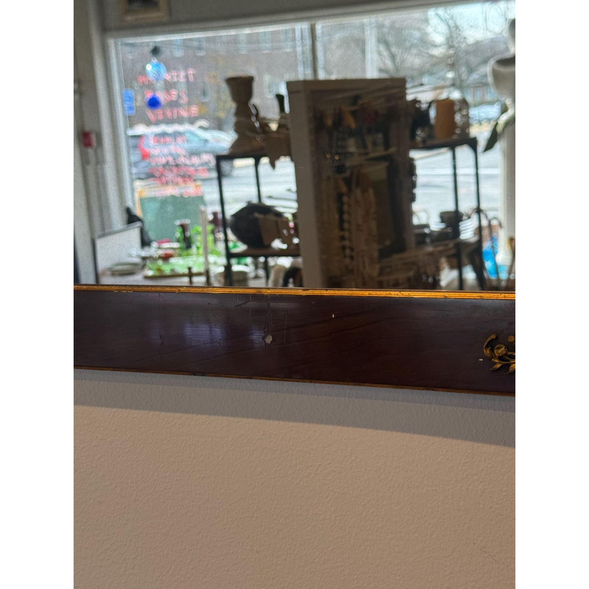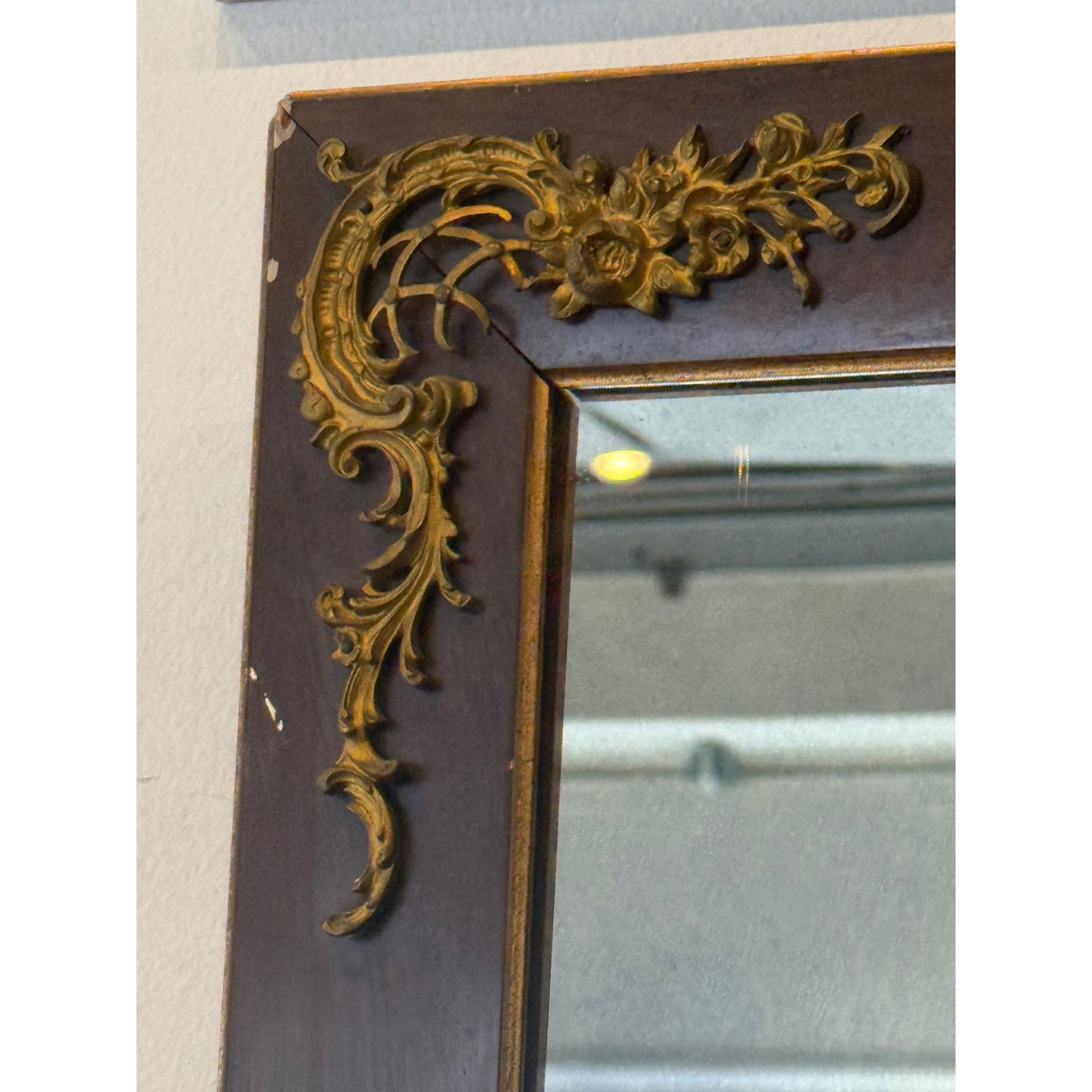 Antique Wooden Framed Mirror With Ornate Brass Floral Corner Accents