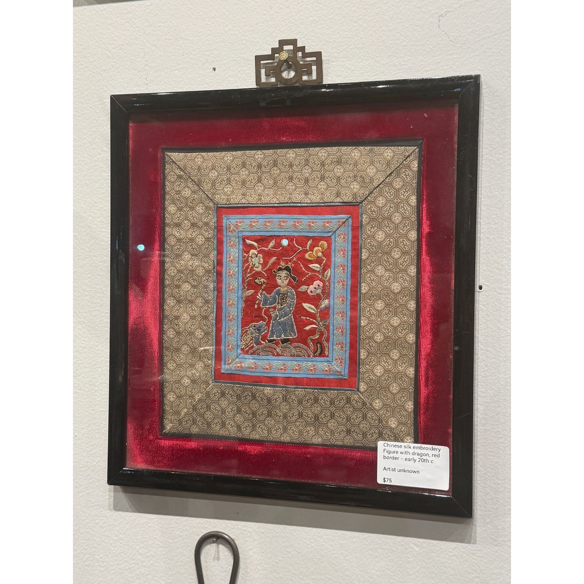 This Chinese silk embroidery showcases intricate craftsmanship from the early 20th century. Encased in a black frame with red velvet matting, it exudes timeless elegance.