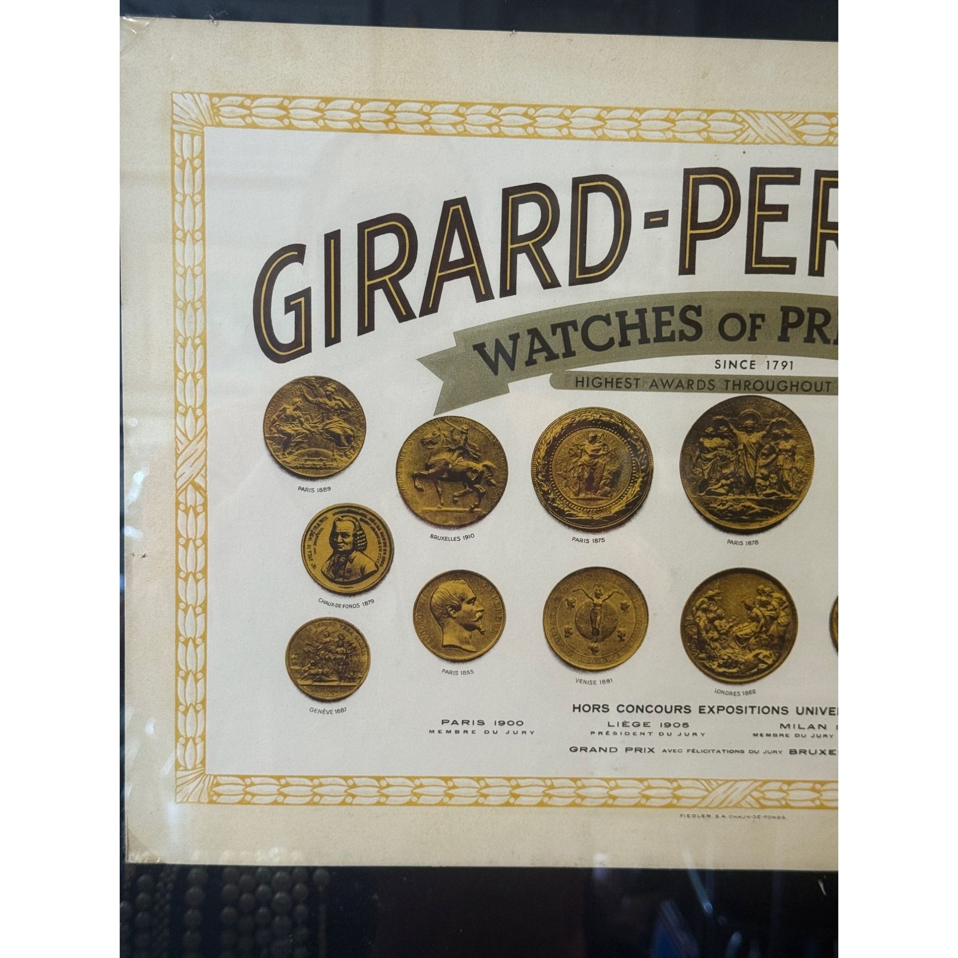 This vintage Girard-Perregaux framed print showcases award medallions from prestigious exhibitions. A timeless piece reflecting the brand's legacy since 1791.