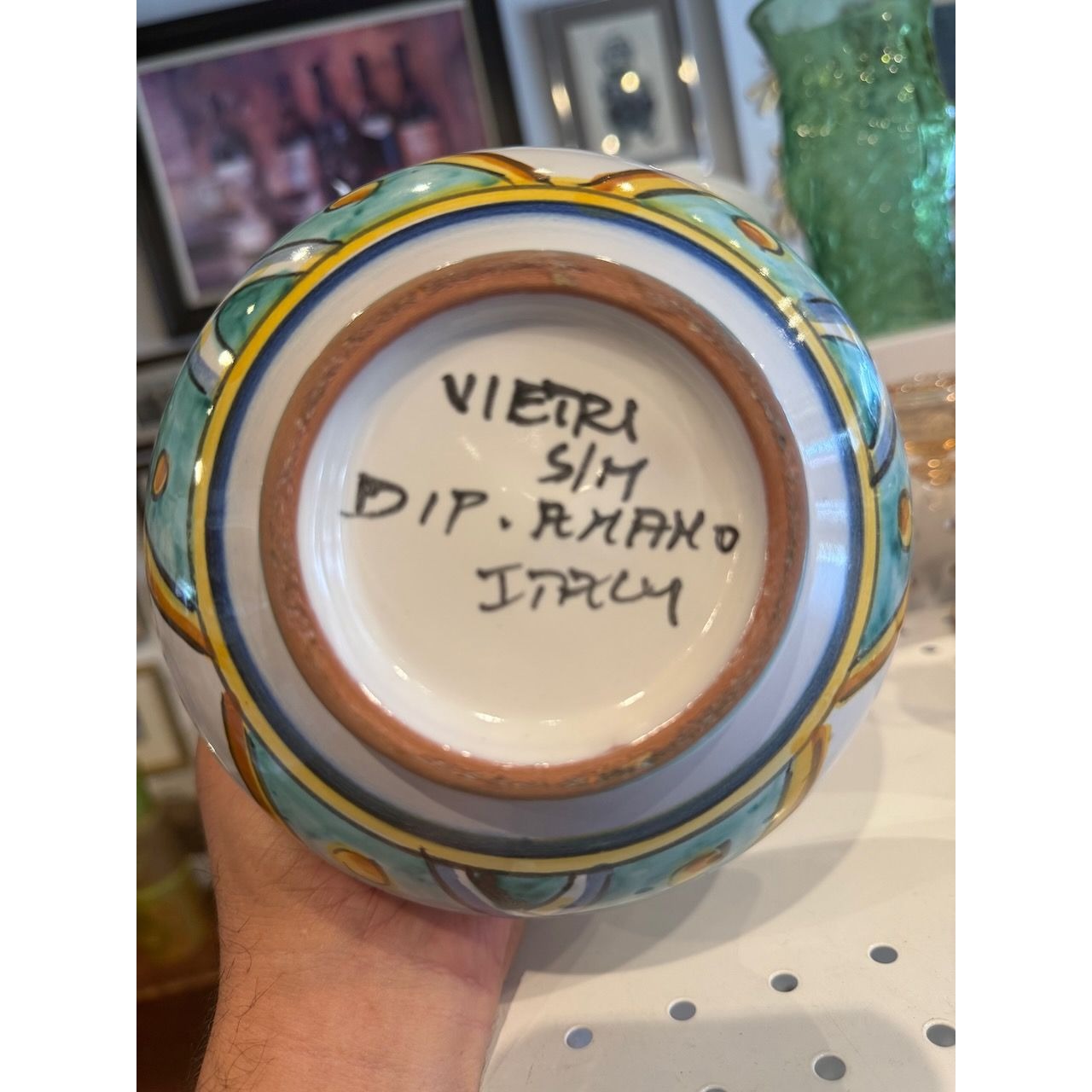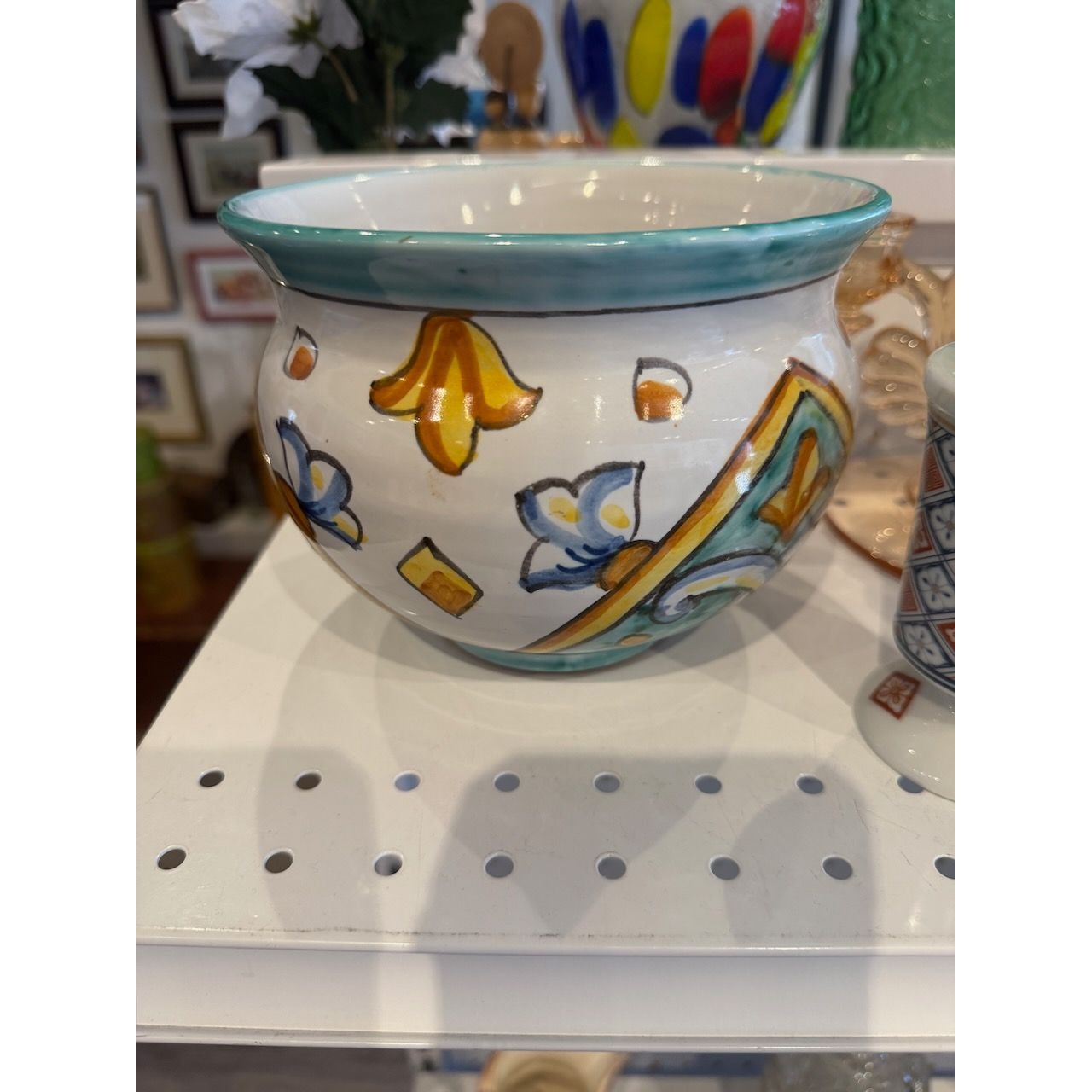 This vintage Italian ceramic vase, marked Vietri S/M, Italy, features vibrant hand-painted floral and geometric designs. A charming addition to curated home collections.