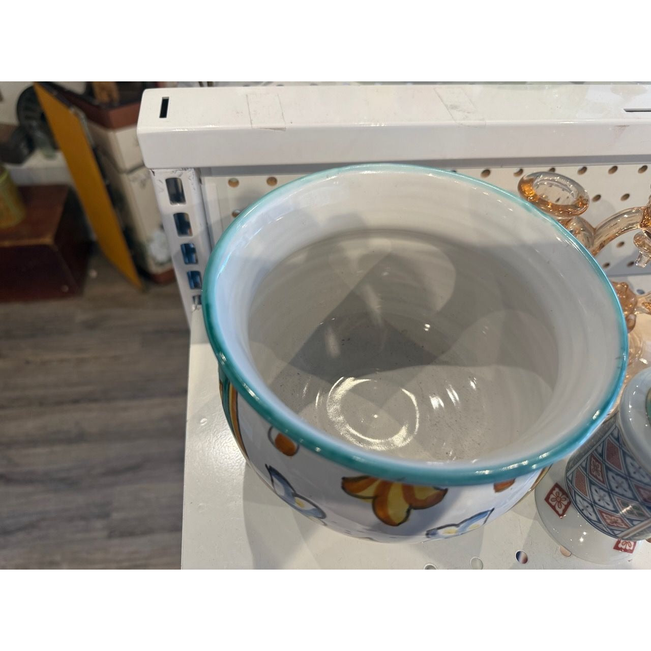 • Multicolor glaze with teal rim