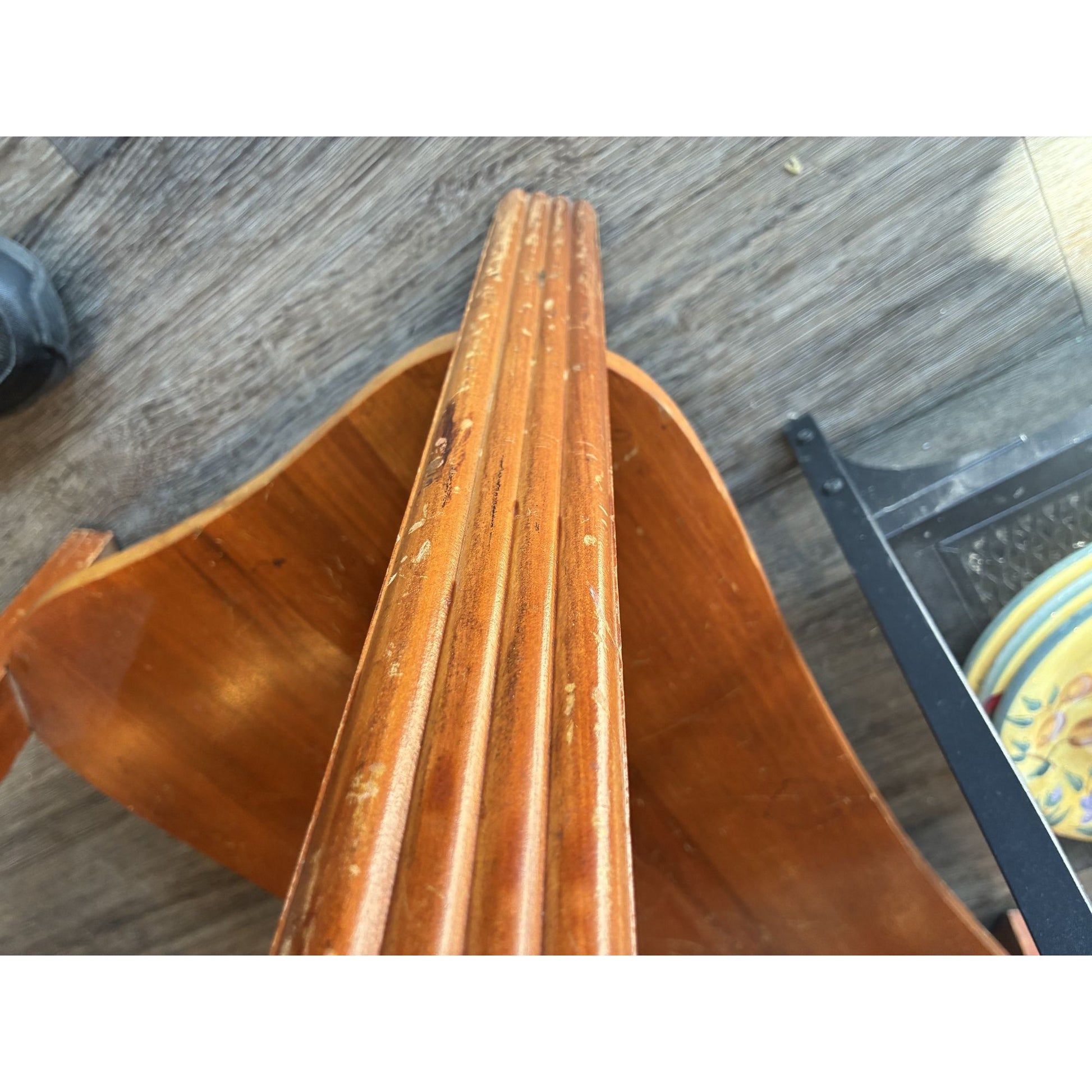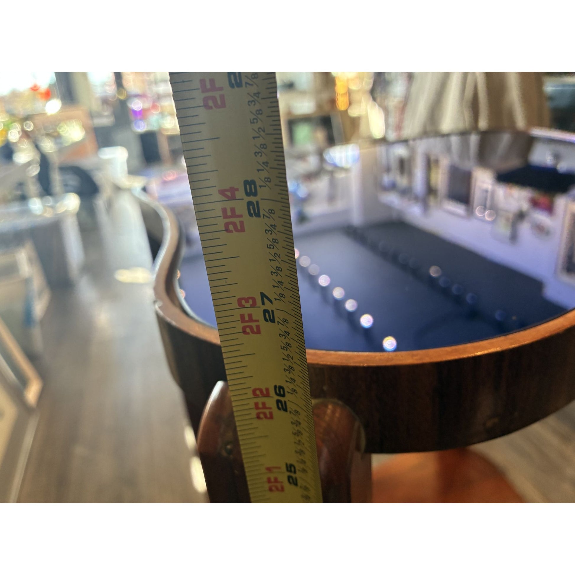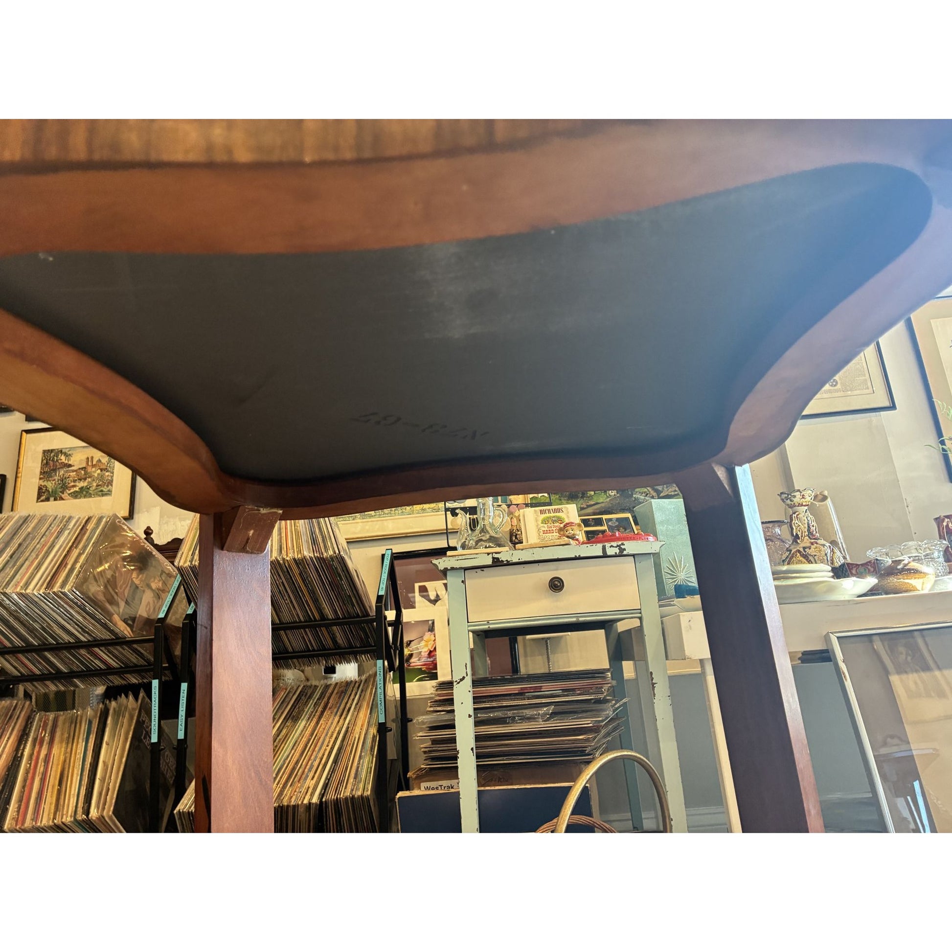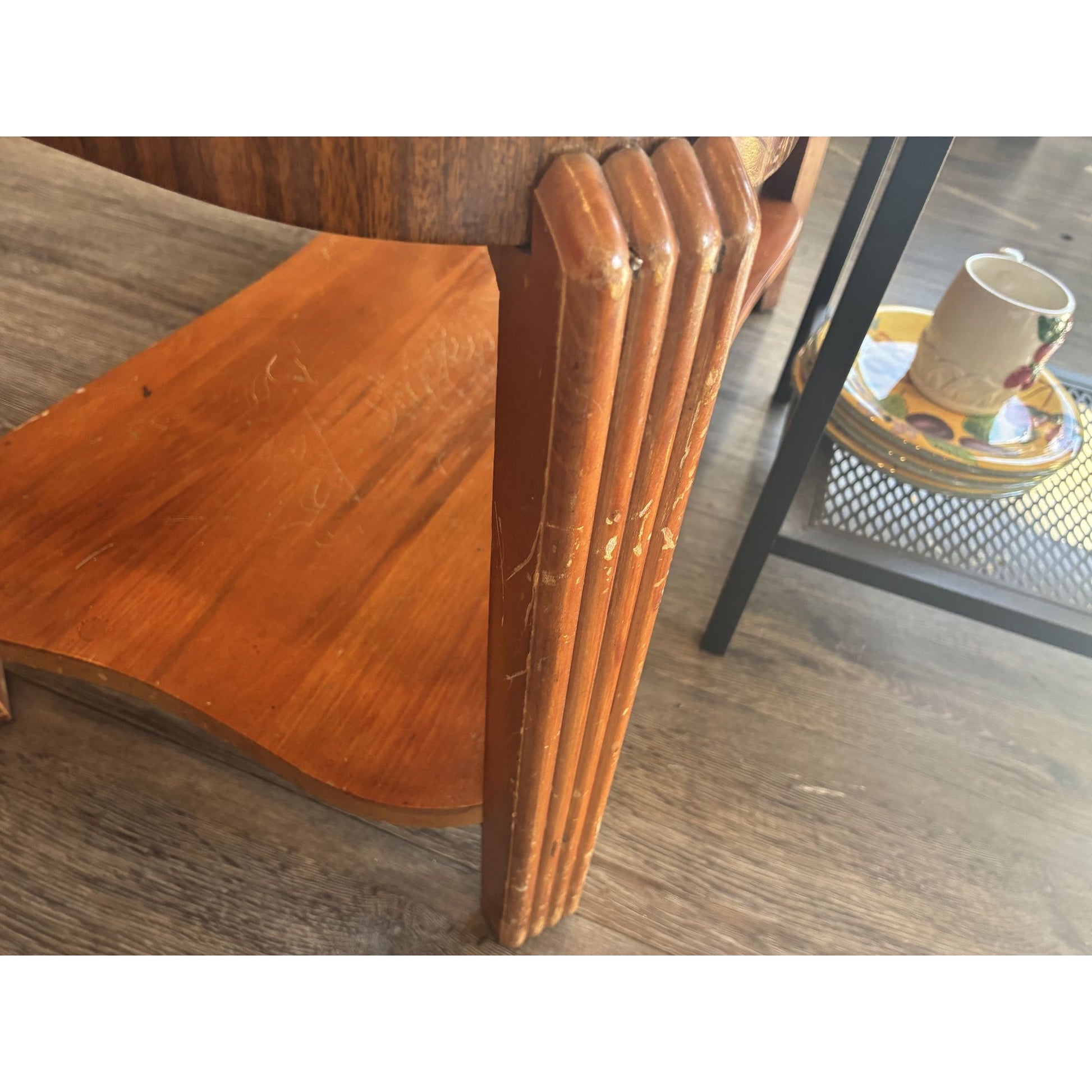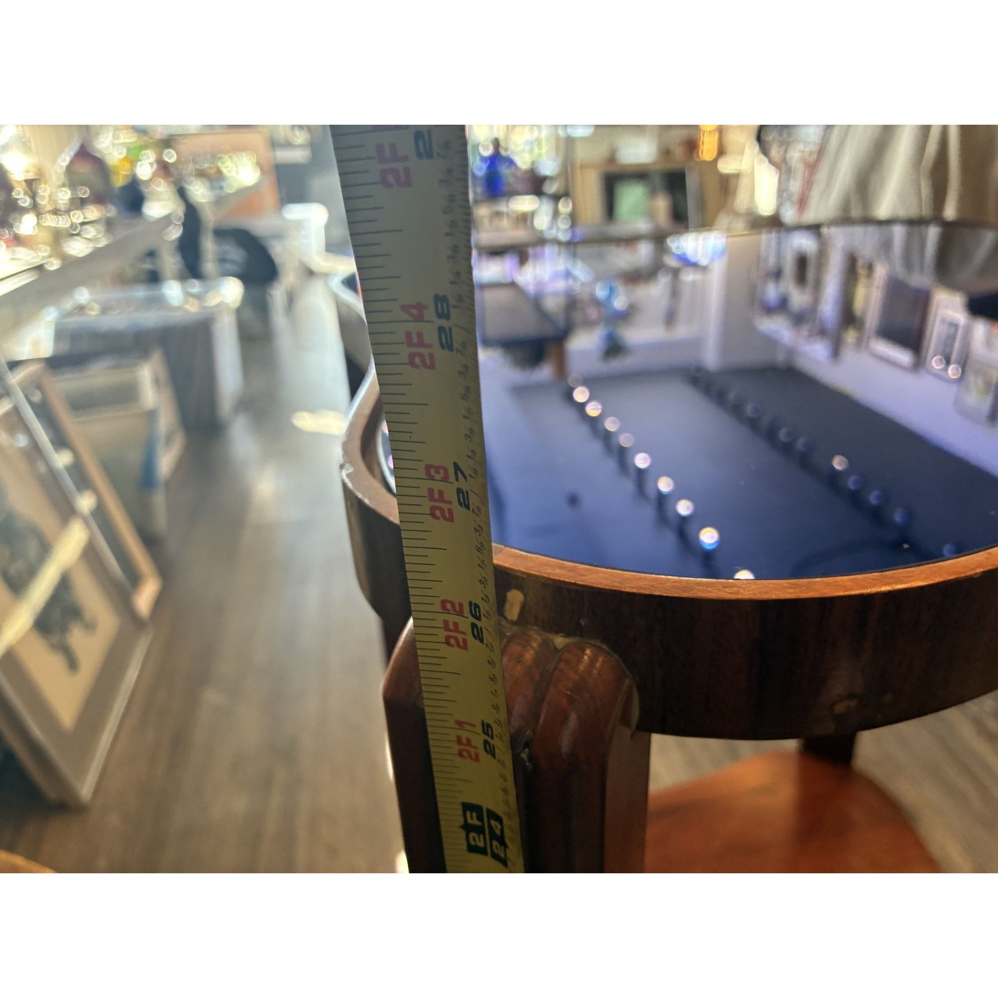 Minor surface scratches on the blue glass top and some surface scratches on the wood, but otherwise in excellent condition.