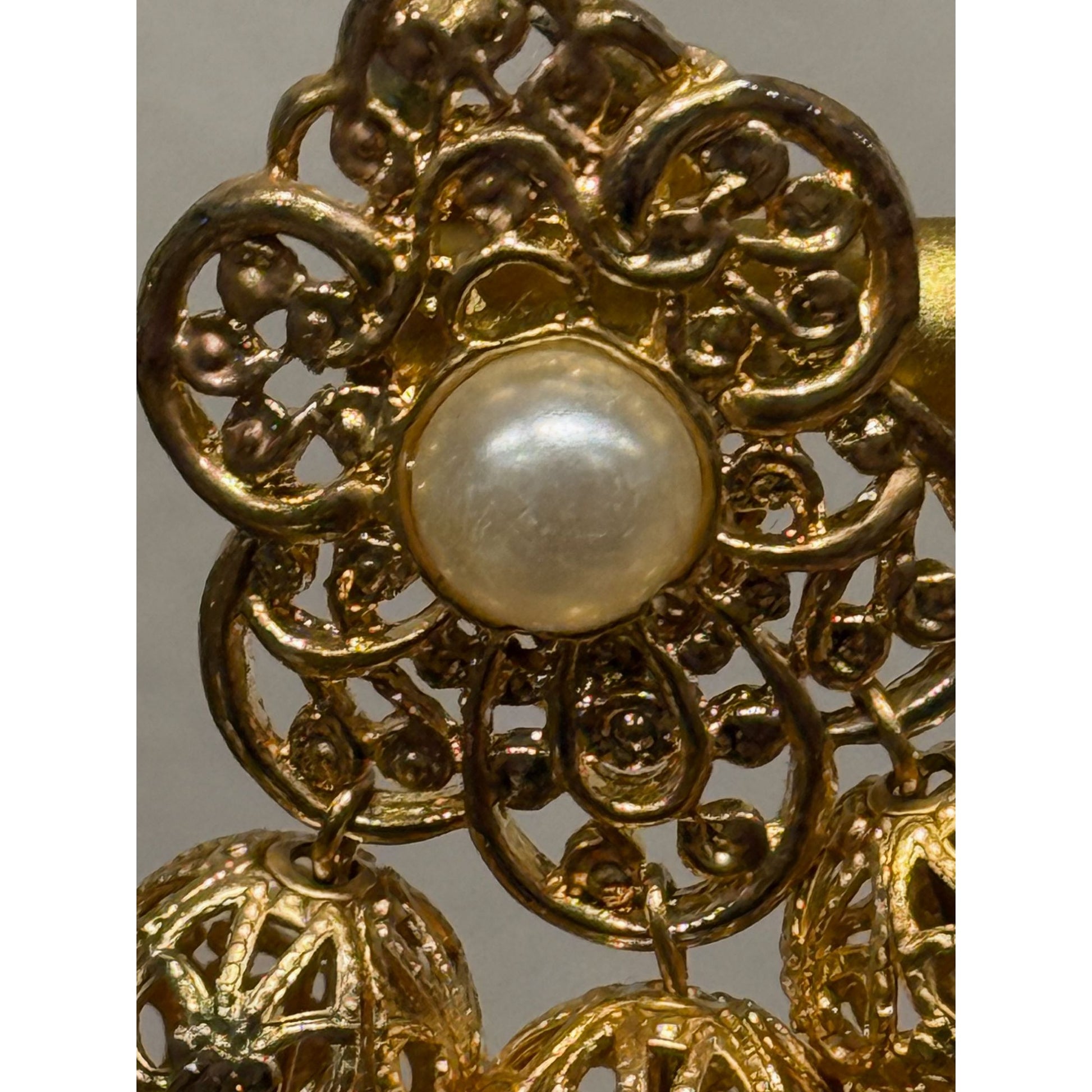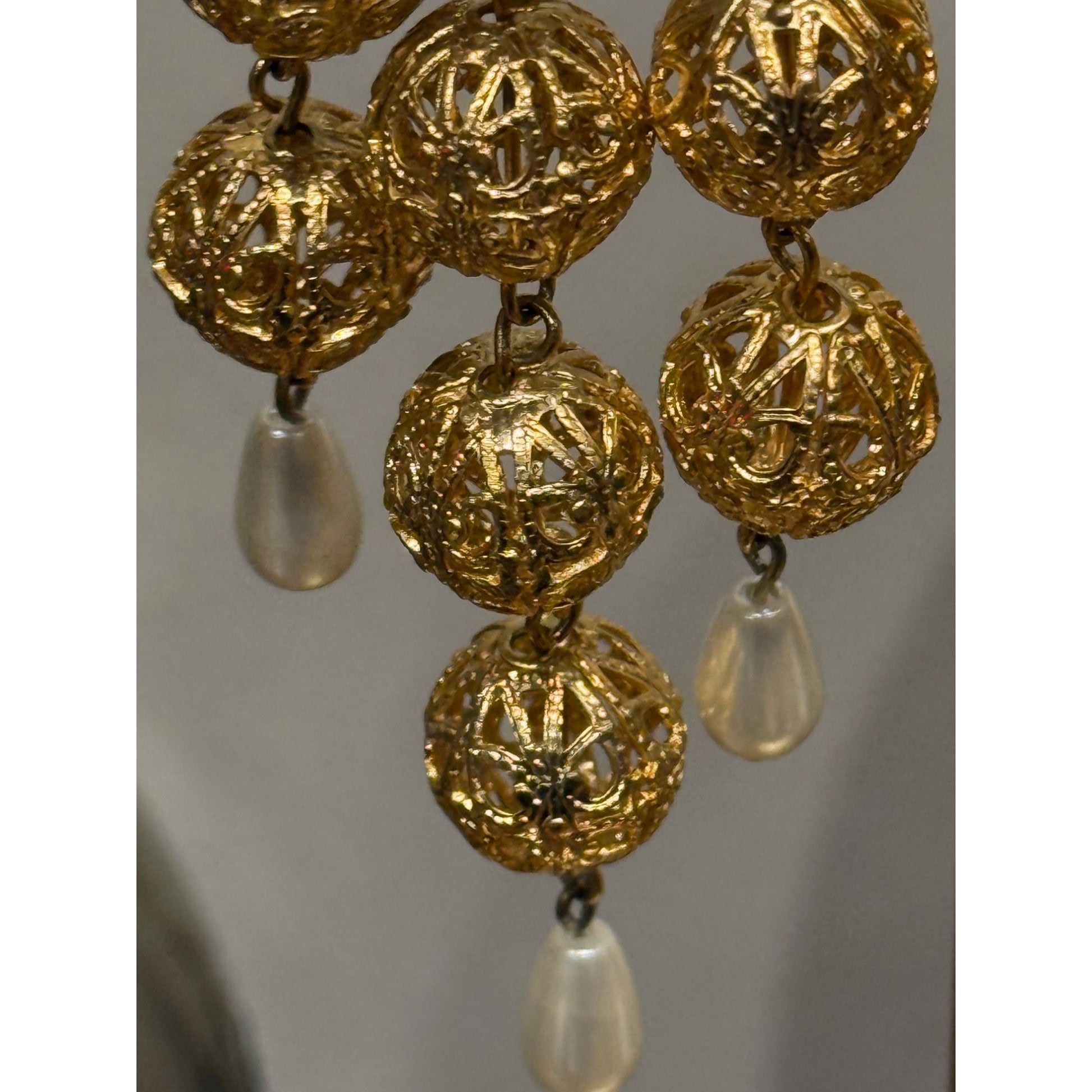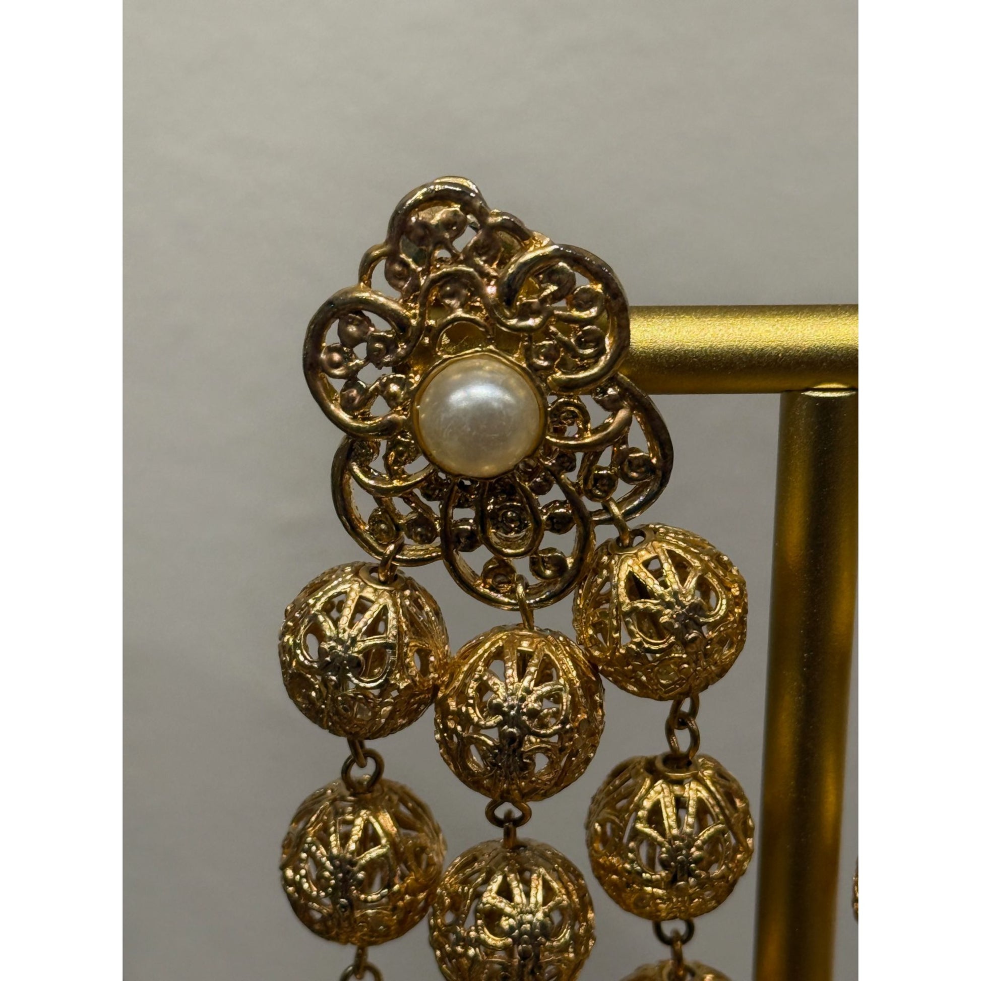 These vintage 1960's earrings feature intricate gold filigree designs, adorned with faux pearls and elegant dangling elements. Their timeless charm adds sophistication to any collection.