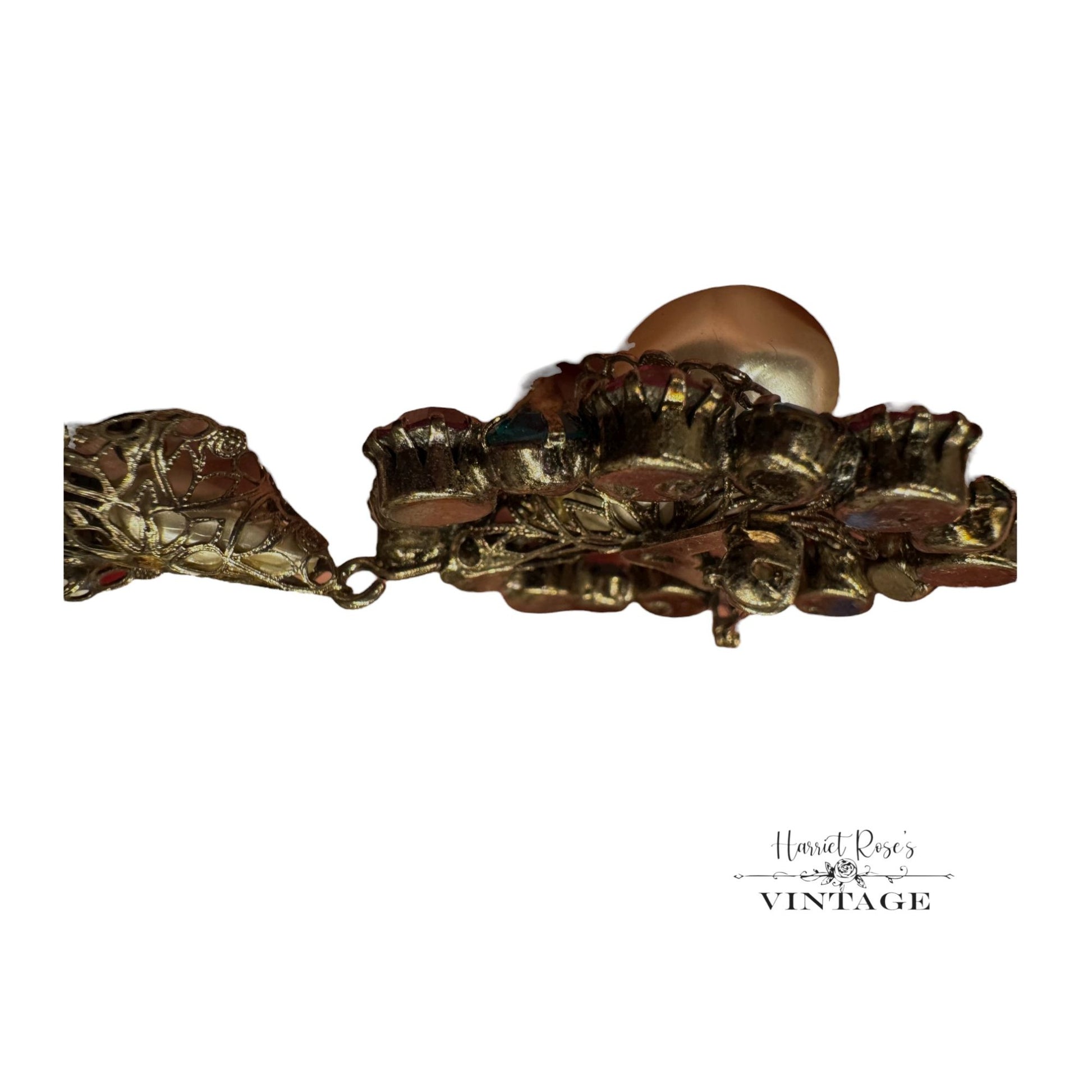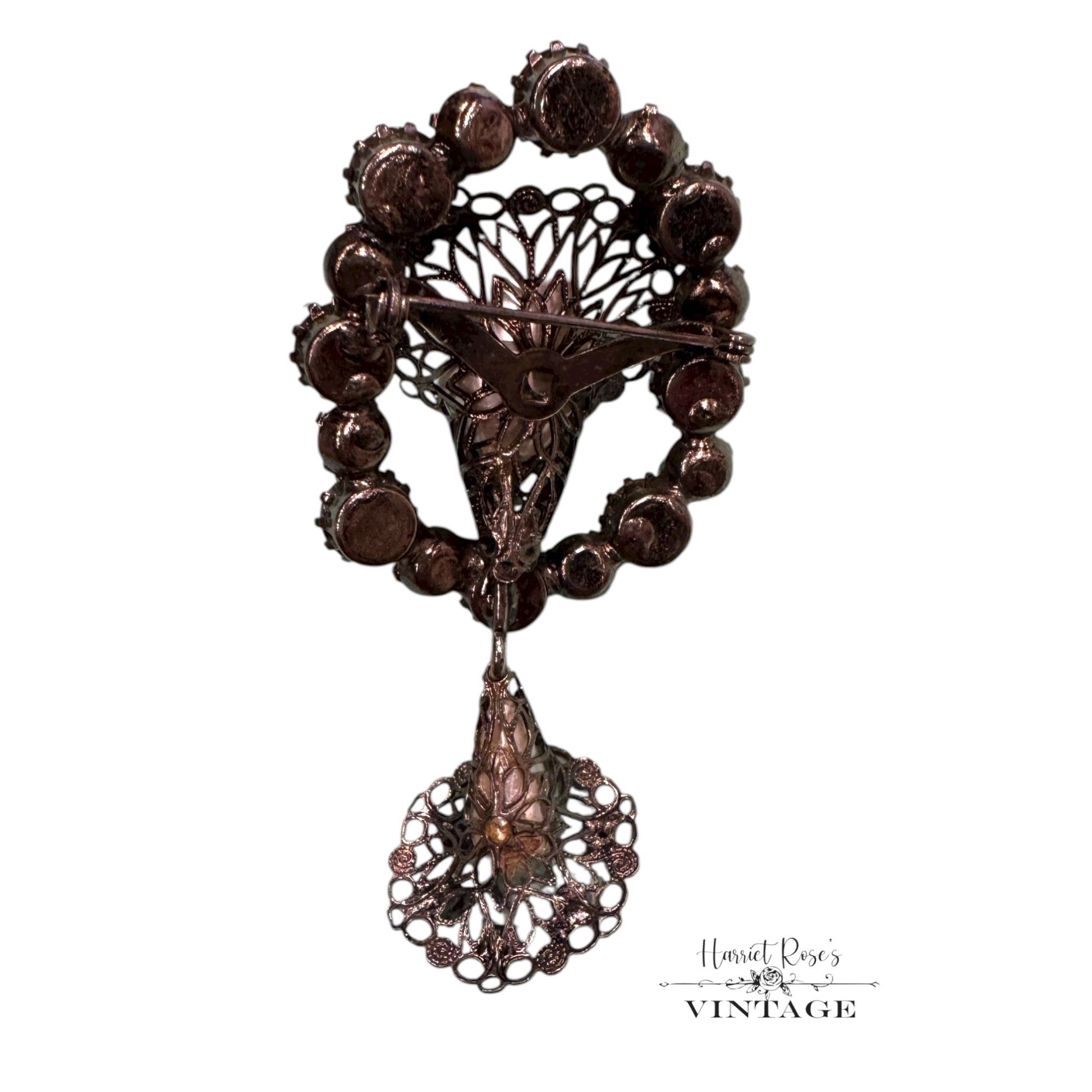 This brooch is an exquisite example of mid-century craftsmanship. Its vibrant pink and blue rhinestones encircle a faux pearl, creating a dramatic focal point. A delicate dangle feature adds movement, while the gold-tone metal provides a touch of antique elegance, making it a piece of timeless artistry.